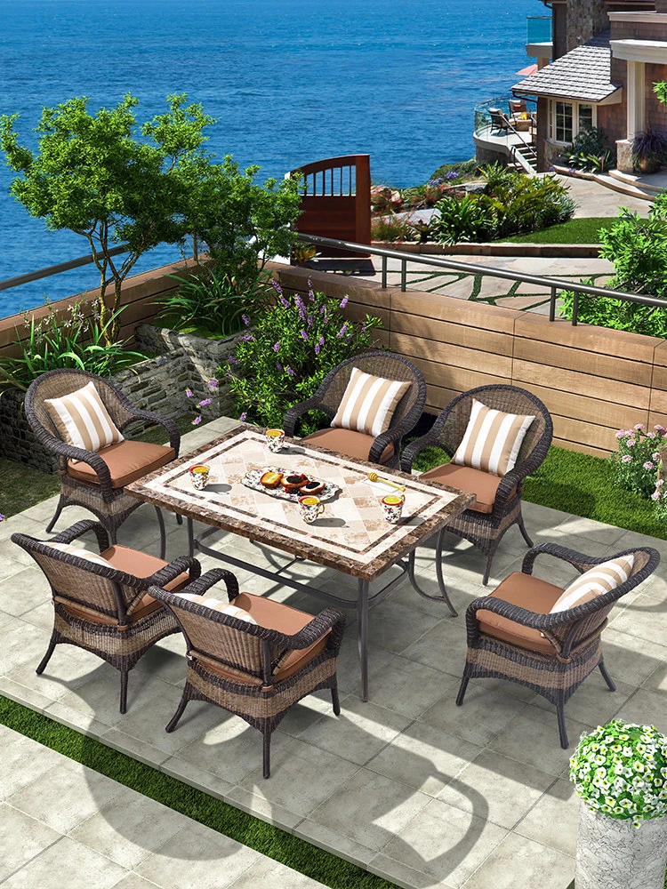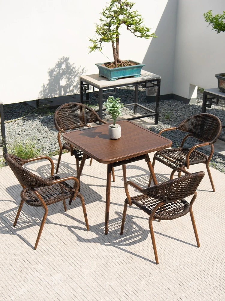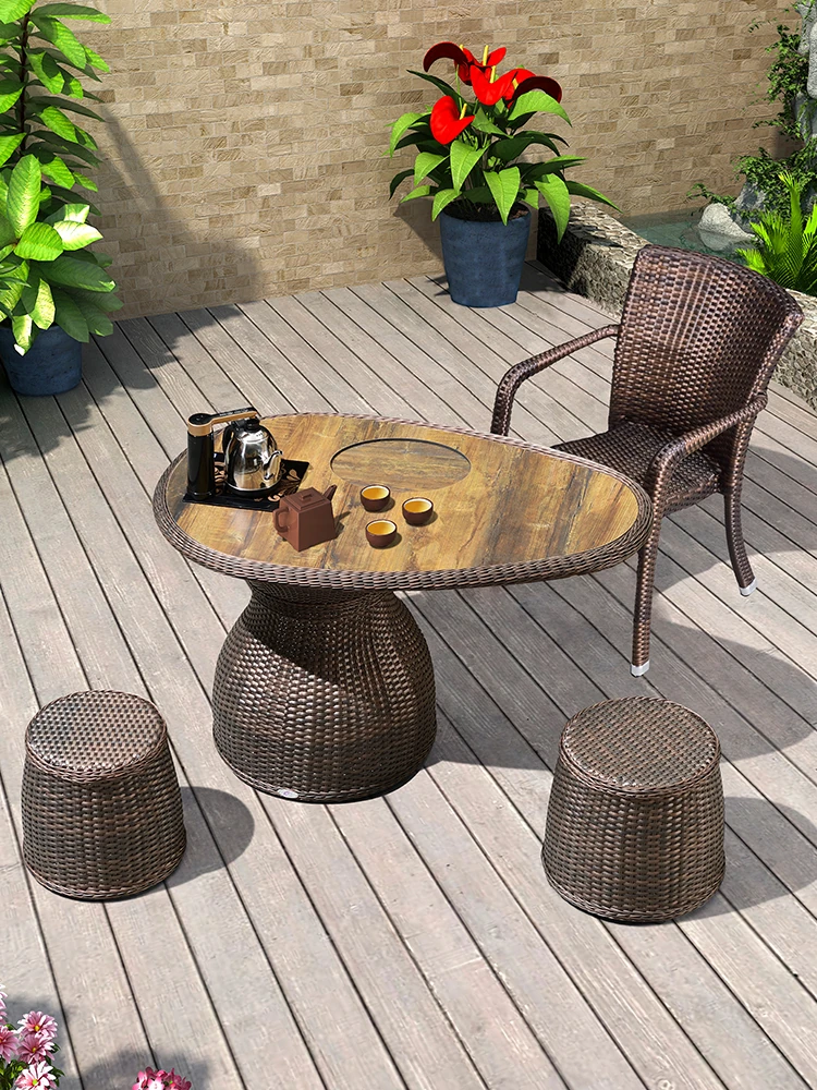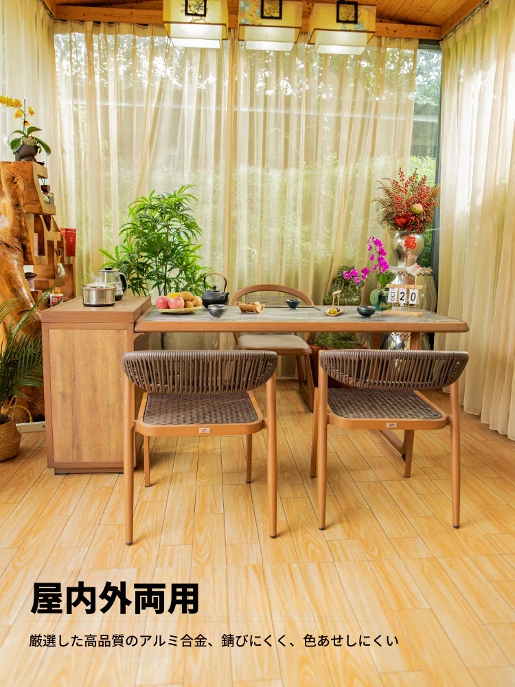 紫葉の囲炉裏で楽しむおしゃれなバルコニー用ティーテーブルセット!シンプルでクリエイティブなデザインの茶卓、炭火で焼肉も楽しめるリラックス用ラタンチェア付き。自宅で特別なひとときを演出!