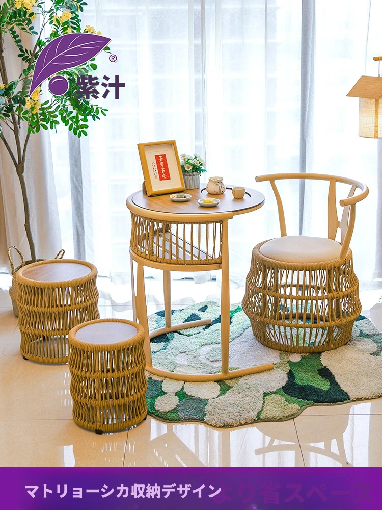 紫葉新中式茶卓椅セット - おしゃれな茶室にぴったり!リビングや庭でのくつろぎのひとときを演出する、上質なラタン編みのティーテーブル。お茶を楽しむための理想的な空間を提供します。