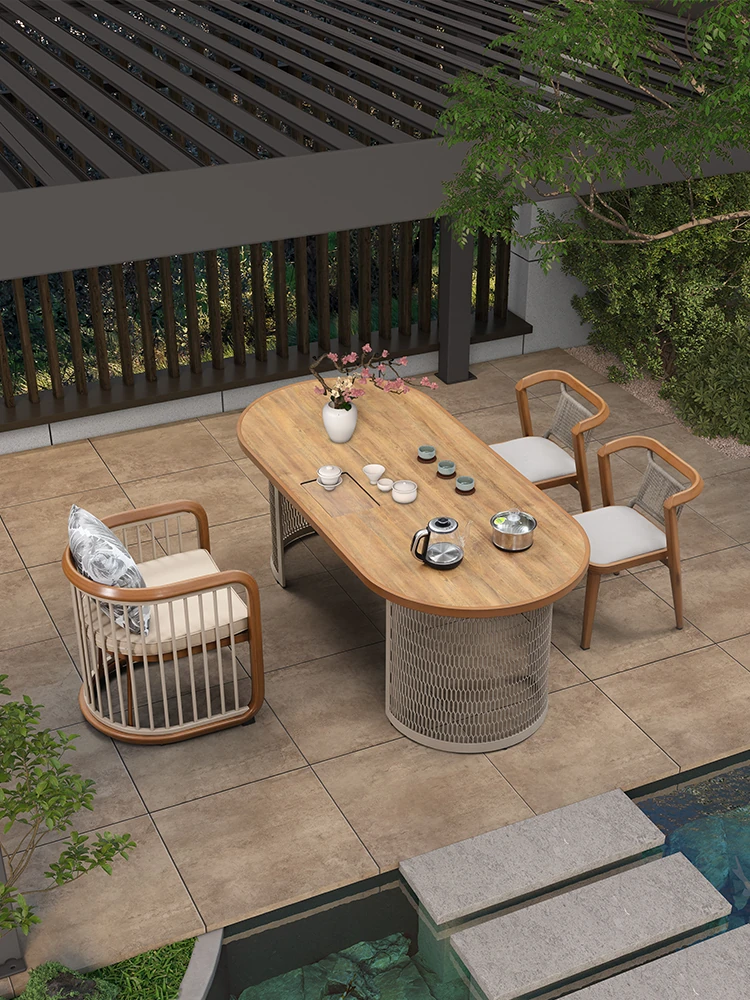 紫葉アウトドア茶卓椅セット - 庭でのティータイムに最適!おしゃれな茶水キャビネットと湯沸かしポットが一体化した新中式デザイン。リラックスしたひとときをお楽しみください。