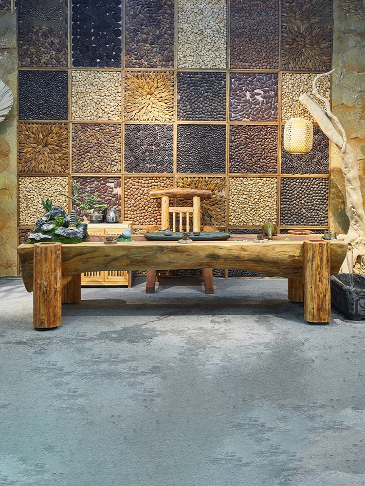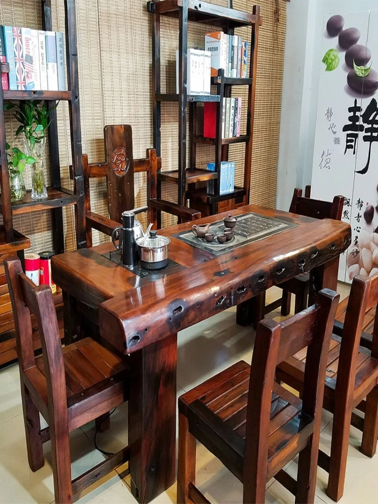 紫葉老船木製茶卓椅セット - オフィスやリビングに最適な新中式の実木茶卓で、優雅なティータイムを演出!高品質な素材で作られた、心安らぐ空間を提供します。