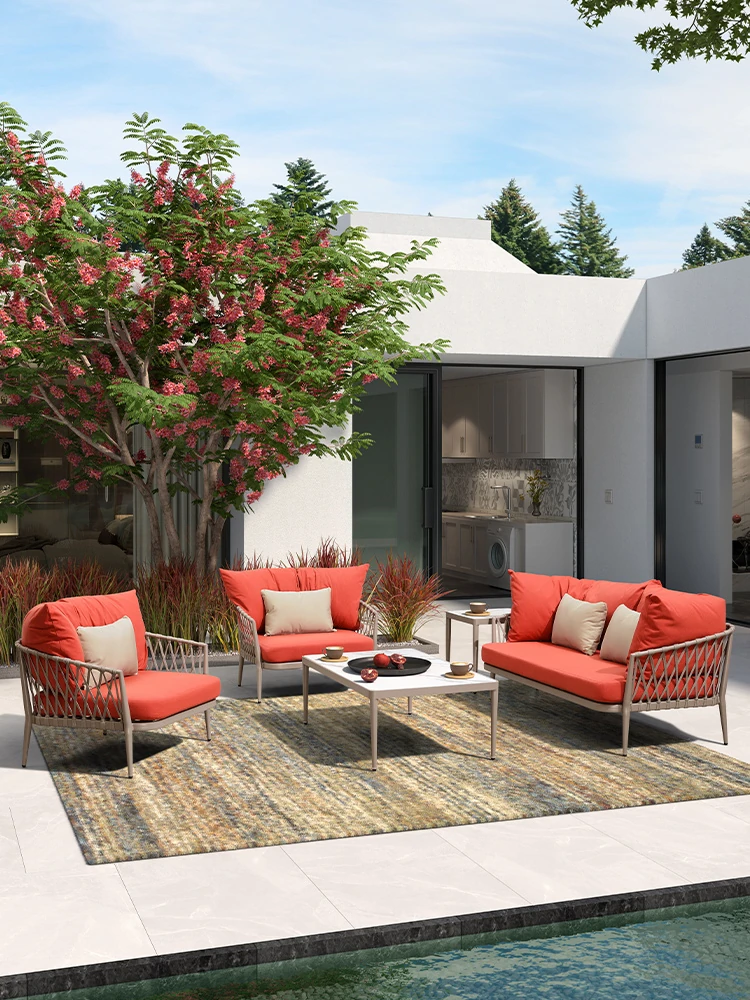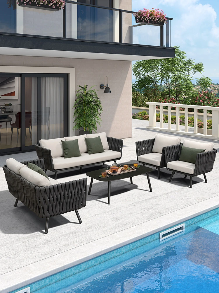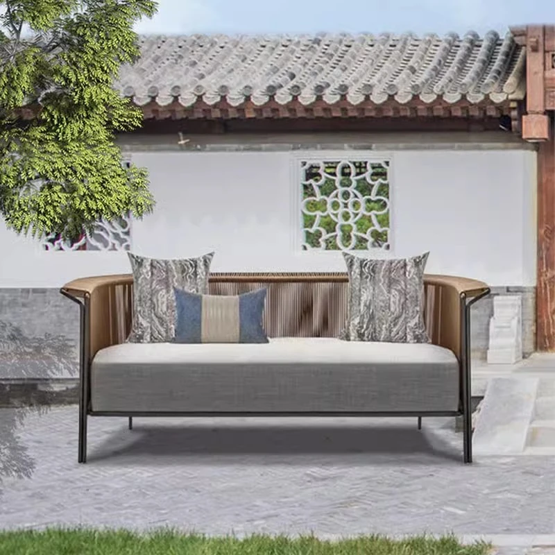 紫葉アルミ合金製ソファー - 北欧スタイルのアウトドアテラス用編み込みソファ、新中式家具の組み合わせで、快適な屋外リラクゼーションをお楽しみください!