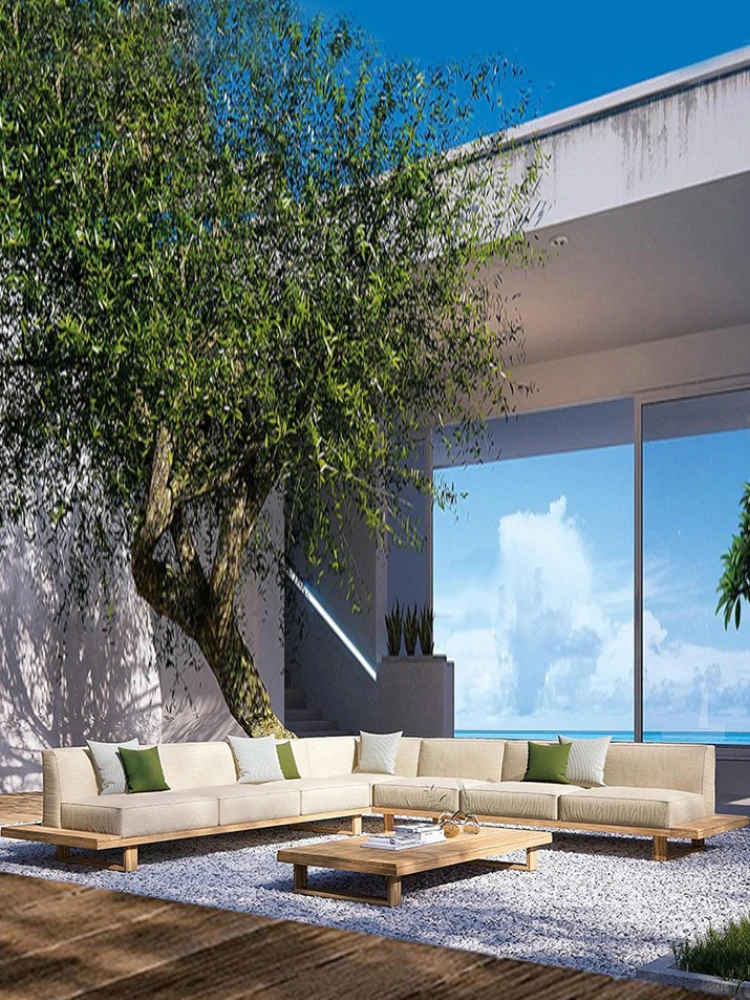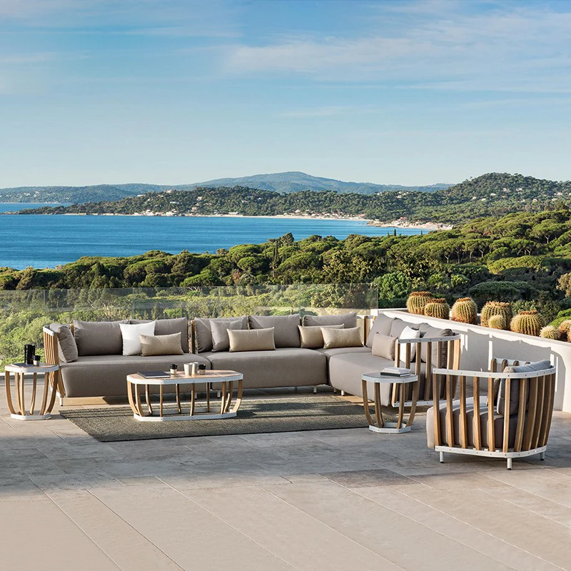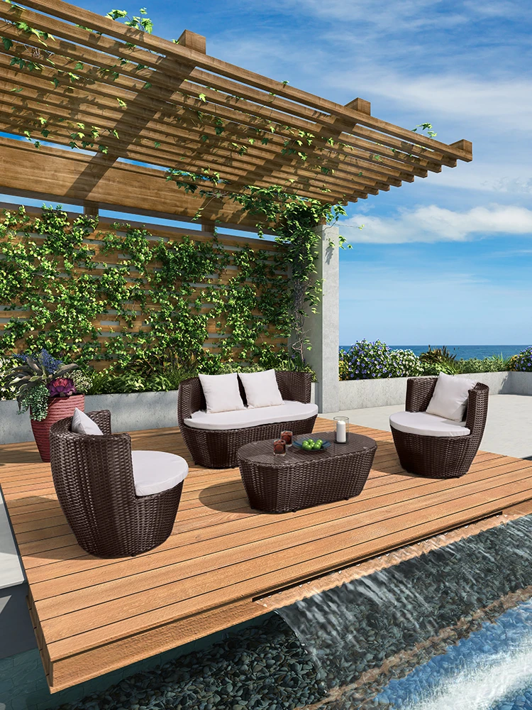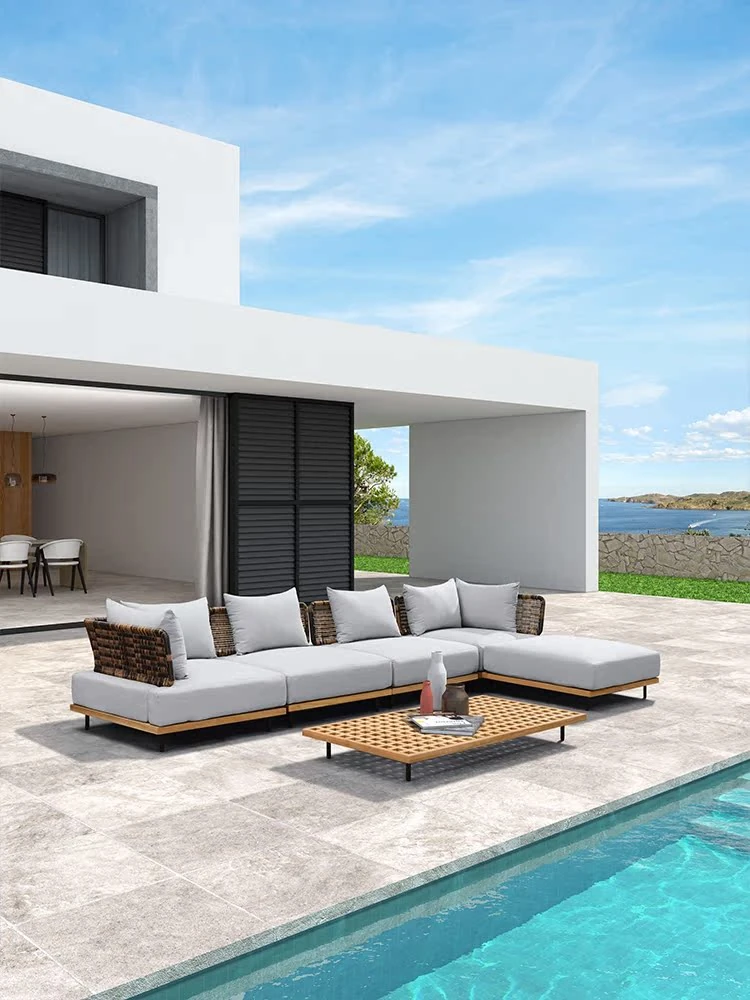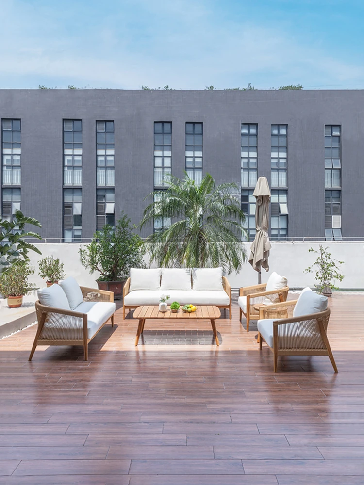 紫葉のアウトドアソファセット|北欧スタイルの無垢材家具|ラタン編みの庭用ヴィラソファ|防水・UVカットのチークソファで、快適な屋外リビングを実現!