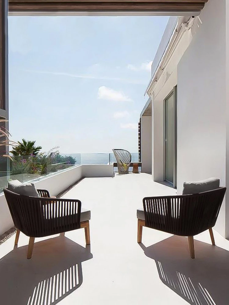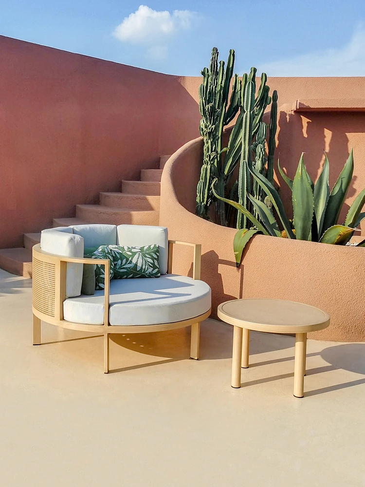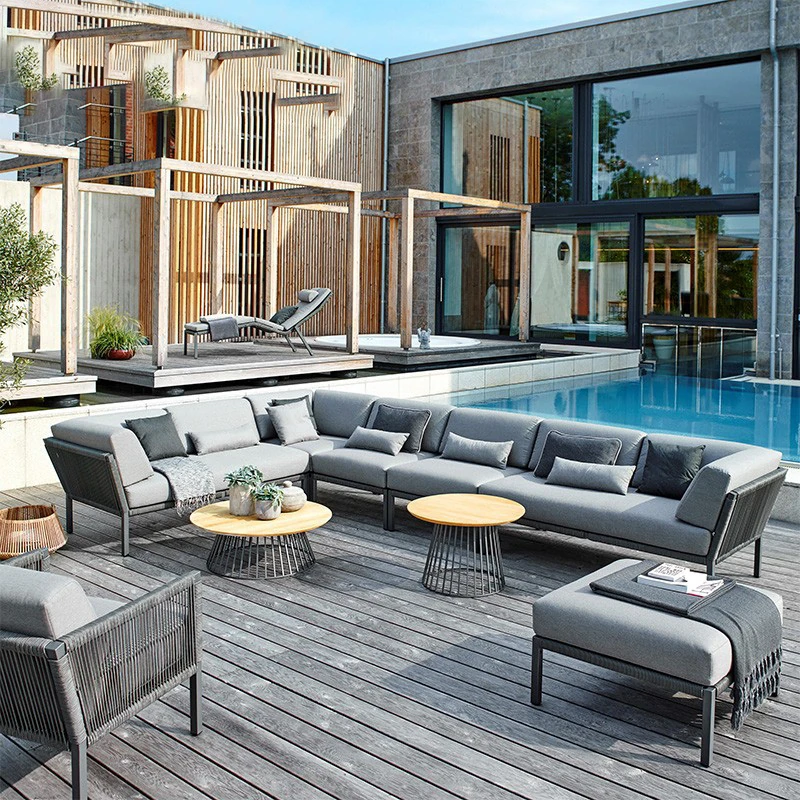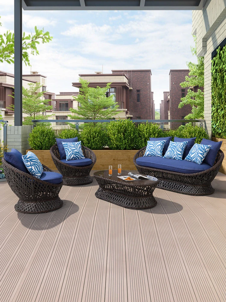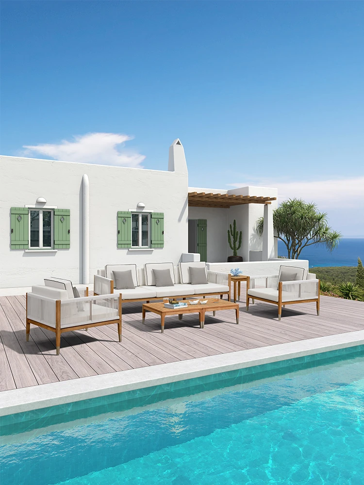 紫葉のアウトドアソファセット|北欧スタイルの無垢材家具|ラタン編みの庭用ヴィラソファ|防水・UVカットのチークソファで、快適な屋外リビングを実現!