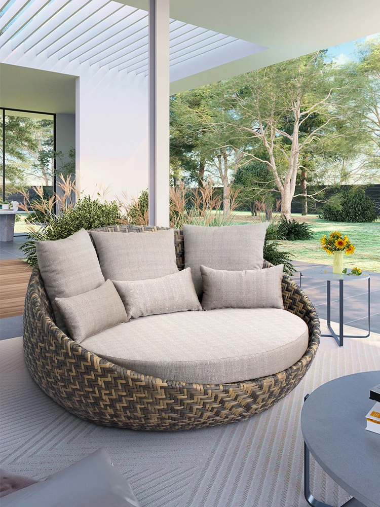 紫色葉の屋外ソファー - 別荘や庭にぴったりの藤編みデザイン!北欧スタイルのリラックスチェア、ホテルや露天でのくつろぎに最適なバードケージソファ!快適さとスタイルが融合した一品です。