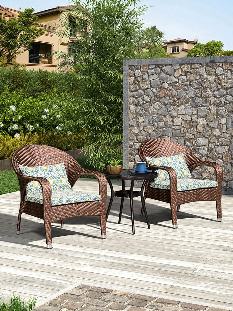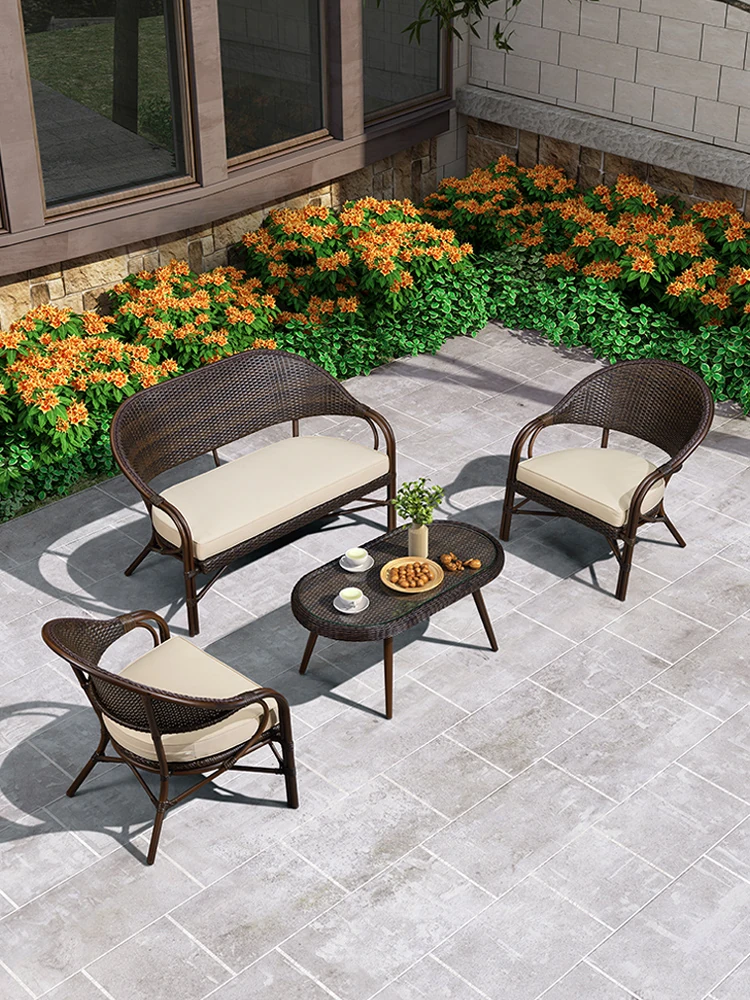 紫葉のアウトドアソファーセット - おしゃれなラタン製ガーデンチェアとテーブルの組み合わせで、民宿や庭に最適なリラックス空間を演出します。屋外でのくつろぎタイムをお楽しみください!