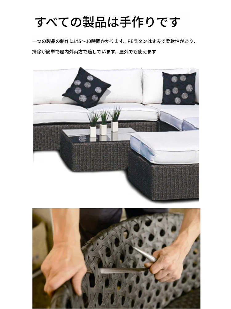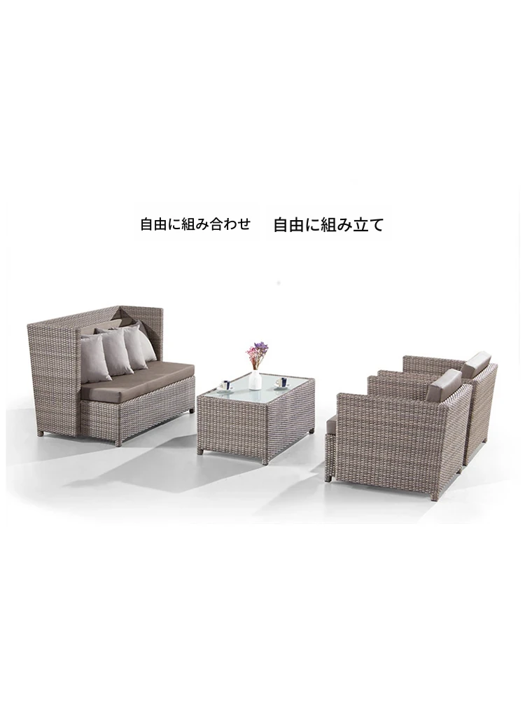 防水仕様の紫葉アウトドアソファ!オフィスやカフェ、ティールームにぴったりのリラックス・ラタンソファ&テーブルセット。スタイリッシュで快適、居心地の良い空間を演出します!