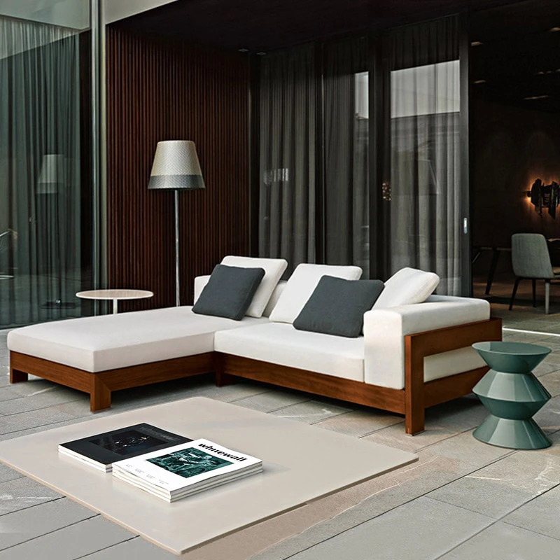 紫葉デザインのアウトドアソファ - 北欧スタイルの別荘庭園用、ホテルのリビングにもぴったりな天然チーク製ソファ。洗練されたデザインと快適さを兼ね備えた、あなたの特別な空間を演出します!