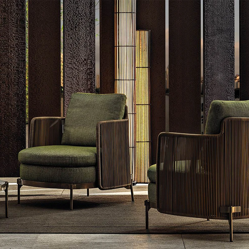 紫色の葉のアウトドアソファ、ラタン製のリラックスチェア。ガーデンや別荘に最適なデザイナーズ家具。テラスでのくつろぎにぴったりな屋外ソファです。
