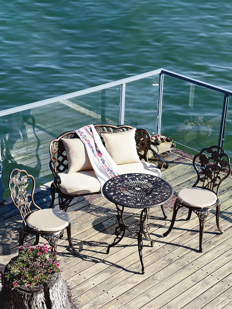 紫葉の庭にぴったり!軽やかで洗練されたアルミ製アメリカンスタイルのアウトドアソファとテーブルセット。高級感溢れるデザインで、リラックスしたひとときをお楽しみください。全アルミ製で耐久性も抜群!