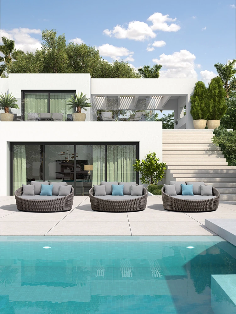 紫の葉の屋外ソファベッド、ヴィラ用ラウンドベッド、リクライニングチェア、ビーチやバルコニー、プールサイドに最適なアウトドアラタンソファ!快適さとスタイルを兼ね備えたリラックス空間を手に入れましょう!