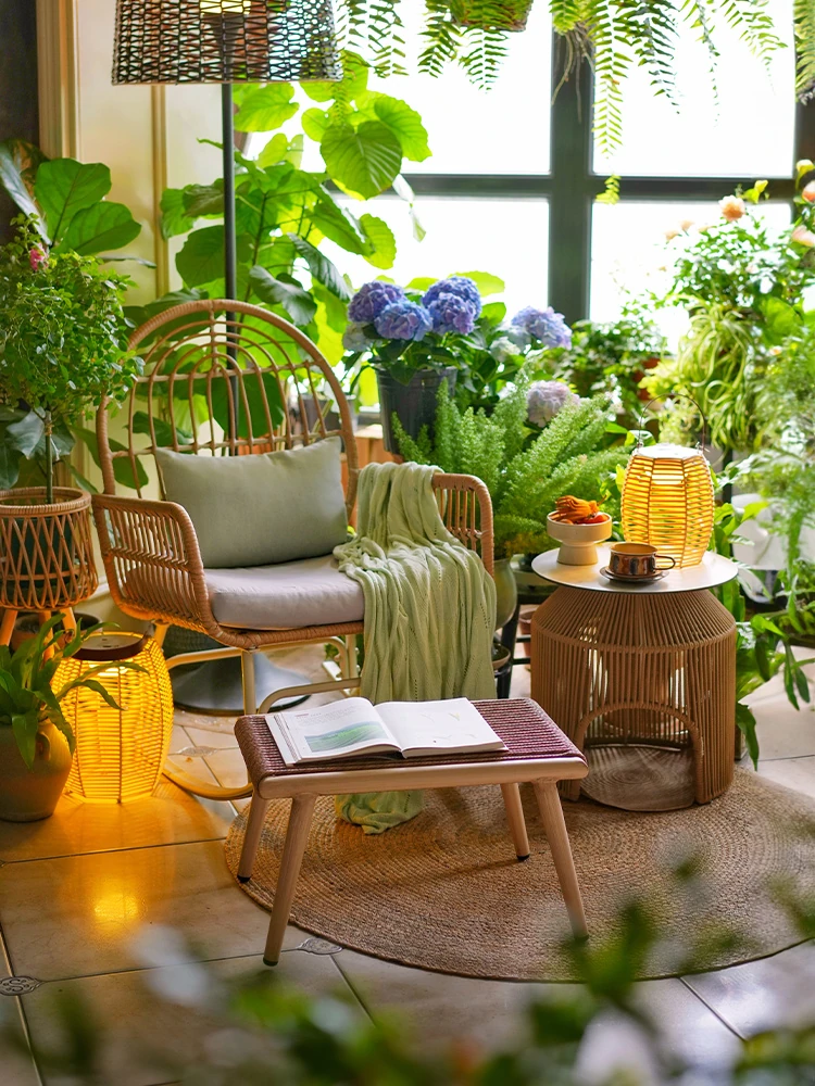 紫葉ビール一人用ソファチェア|リラックスできるミニマルデザインのロッキングチェア|モダンな藤編みのレジャーチェアで、くつろぎのひとときをお楽しみください!